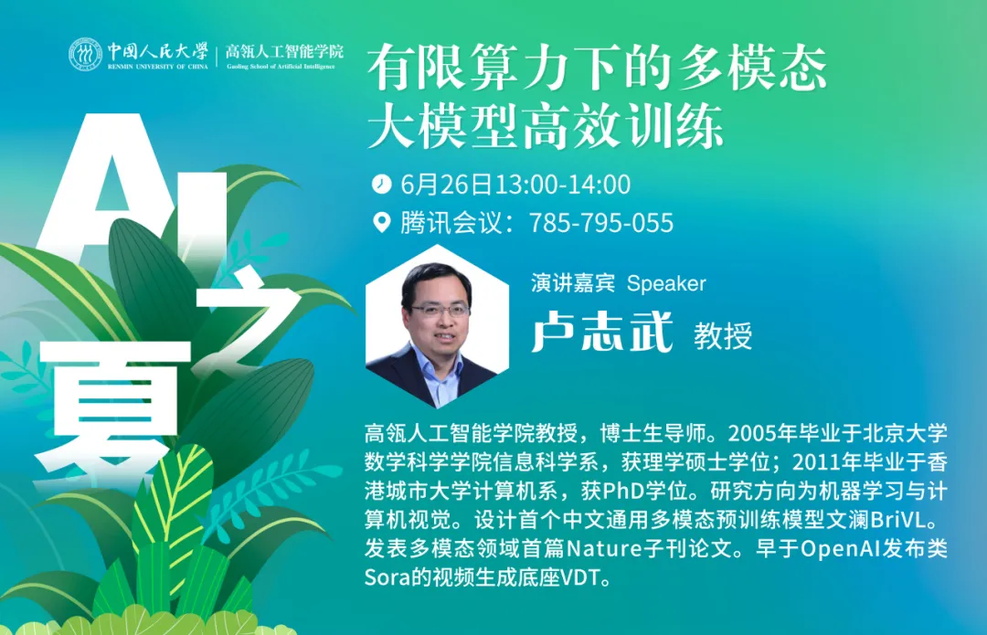 “AI之夏”研招系列学术讲座第13讲,由人大蘑菇视频 卢志武教授为大家主讲。