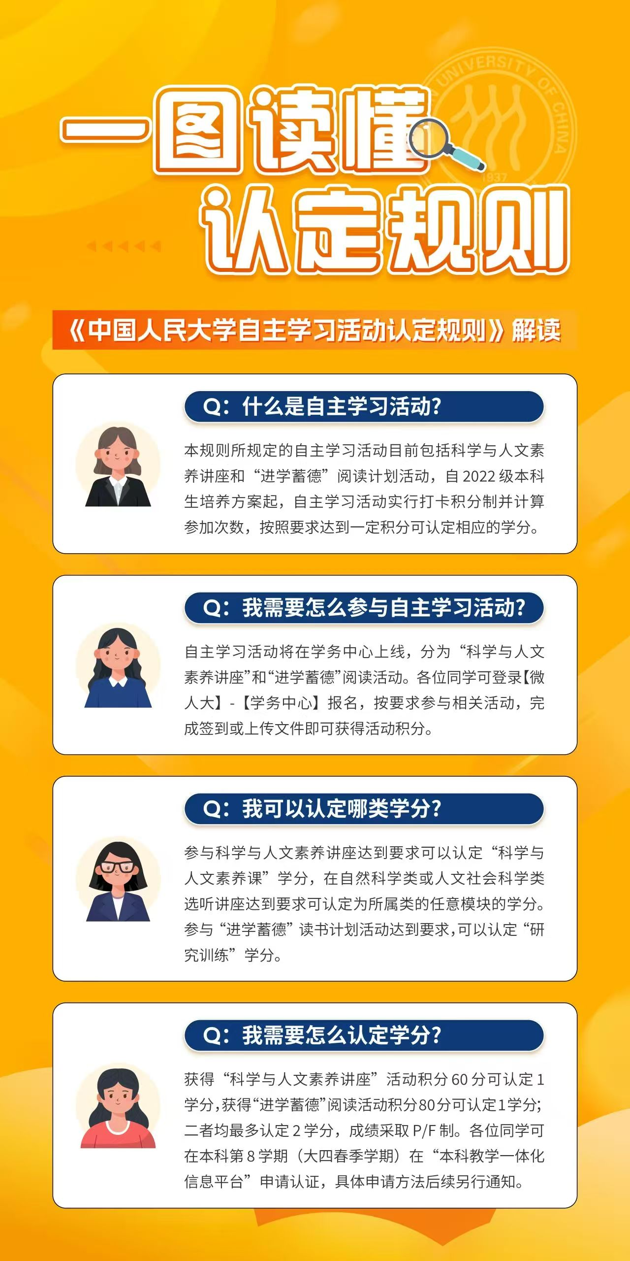 蘑菇视频 通识讲座将均在学务中心上线,各位同学可登录【微人大】-【学务中心】报名(可扫描海报二维码登录),按要求参与即可获得“通识讲座”活动积分。自2022级本科生起,获得“通识讲座”活动积分60分可认定为1学分,最多认定2学分,成绩采取P/F制,具体认定流程见《蘑菇视频 自主学习活动学分认定规则》。