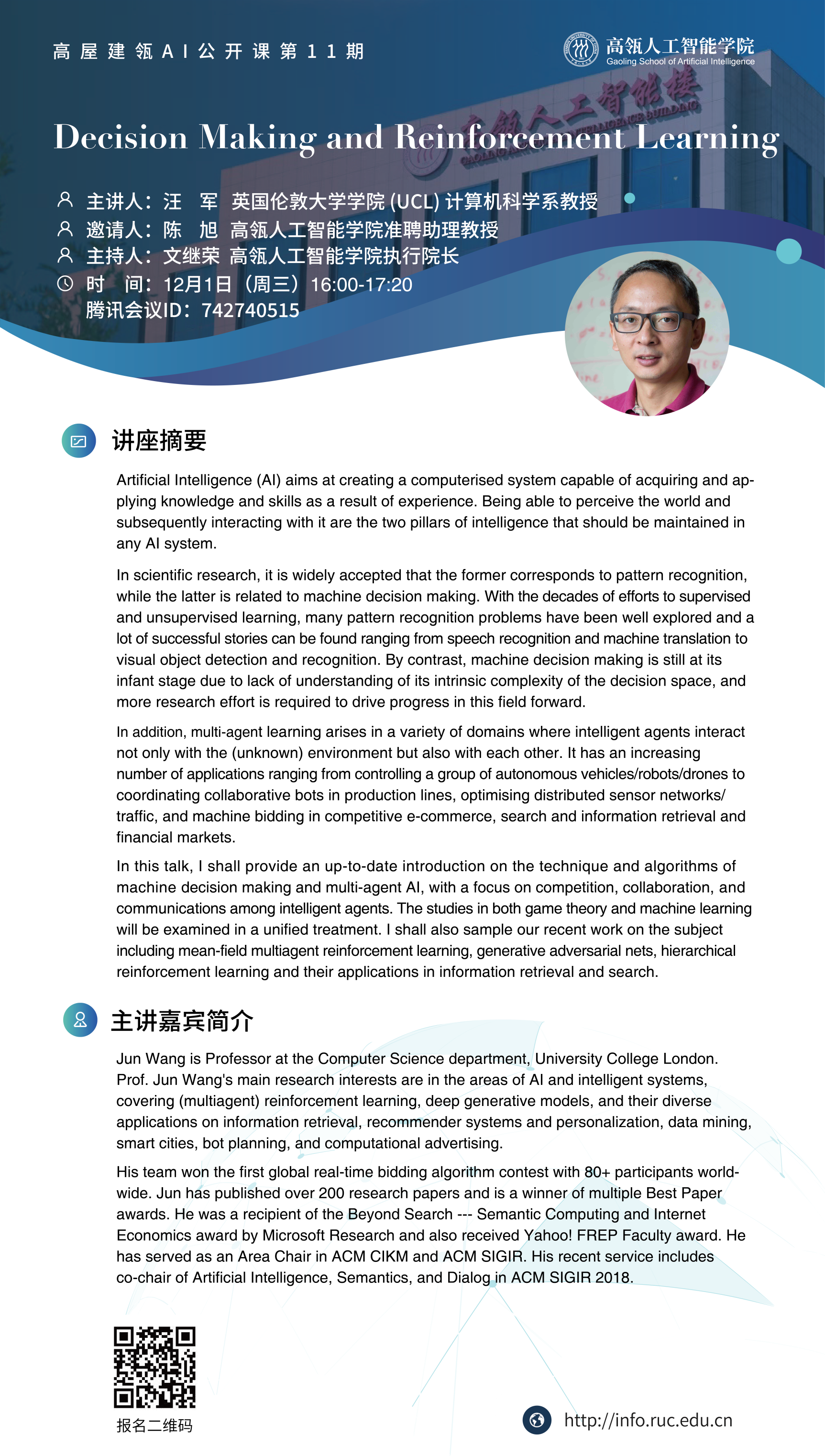 Jun Wang is Professor at the Computer Science department, University College London. Prof. Jun Wang's main research interests are in the areas of AI and intelligent systems, covering (multiagent) reinforcement learning, deep generative models, and their diverse applications on information retrieval, recommender systems and personalization, data mining, smart cities, bot planning, and computational advertising.