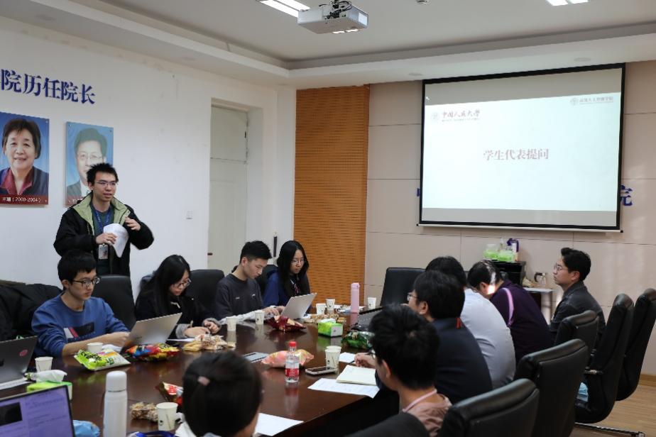 接着,郭歌扬同学提出她在课后学习中的困惑,同学们也分享出了他们在学习中遇到的具体问题。文继荣院长表示,学院会进一步要求各门课程明确教学内容与评价标准,加强与学生的沟通,适当做出调整。窦志成副院长通过具体例子,为同学们进一步解答了这些问题,提供了学习建议和指导,并与同学们讨论了课程改革的可能性。