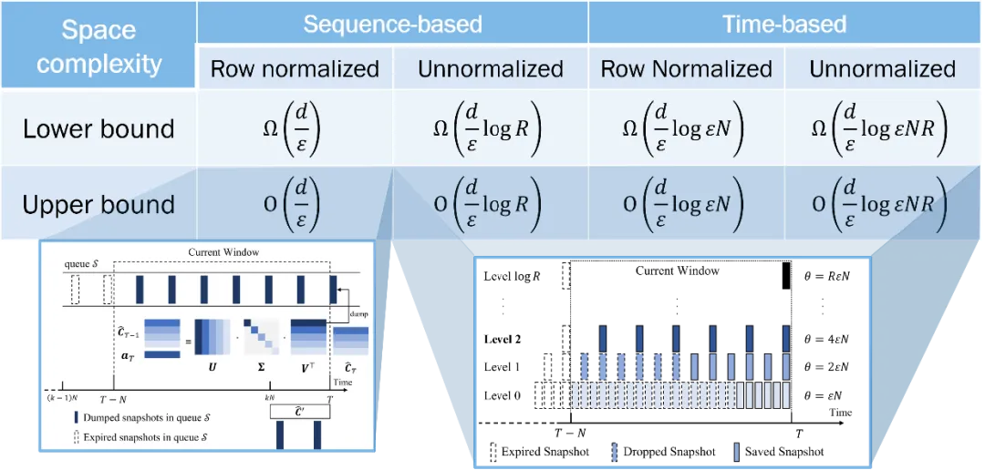 论文介绍: 流数据上的矩阵略图算法的优化及其在在线机器学习领域的应用获得了越来越多的关注,本文关注流数据挖掘和学习领域的开放性难题——“在滑动窗口数据流上以 ε 的误差近似一个 N×d 的矩阵最少需要多大的空间?”。该工作证明了任何确定性算法的空间复杂度都至少为 Ω(d/ε) 的下界,并提出了达到该最优空间复杂度下界的确定性算法。 此前,渐进空间复杂度最低的滑动窗口上的矩阵略图算法是魏哲巍教授课题组、阿里巴巴李飞飞博士等合作于发表在SIGMOD 2016上的论文Matrix Sketching Over Sliding Windows上提出的:以 ε 的误差近似一个 N×d 的矩阵需要 O(d/ε⋅log(1/ε)) 的空间。由于该工作仅仅研究了如何将流数据场景下的最优矩阵略图确定性算法Frequent Directions与通用滑动窗口算法框架相结合,且这些框架通常需要带来额外的空间开销,使得该算法的空间复杂度与最优界 Ω(d/ε) 之间相差一个系数项 log(1/ε) 。