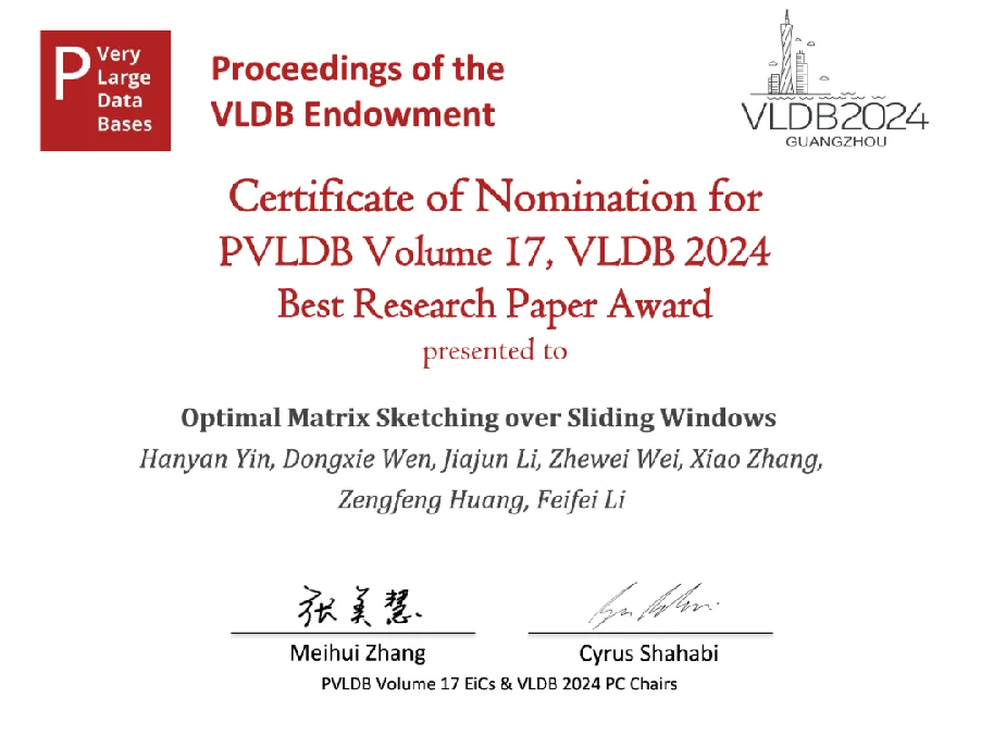 8月29日,数据管理与数据库领域国际学术会议VLDB 2024公布了论文获奖名单,蘑菇视频 魏哲巍教授、张骁助理教授与复旦大学黄增峰教授、阿里巴巴集团李飞飞博士合作的论文“Optimal Matrix Sketching over Sliding Windows”获得了最佳论文提名奖(Best Research Paper Nominations)。魏哲巍教授担任本文通讯作者,其与张骁助理教授指导的硕士生尹涵燕、博士生文东勰和李家郡为学生作者。VLDB(International Conference on Very Large Data Bases)会议是数据管理与数据库领域的三大国际顶尖学术会议之一,被中国计算机学会(CCF)推荐为A类国际会议。VLDB 2024会议于2024年8月26-30日在广州召开。