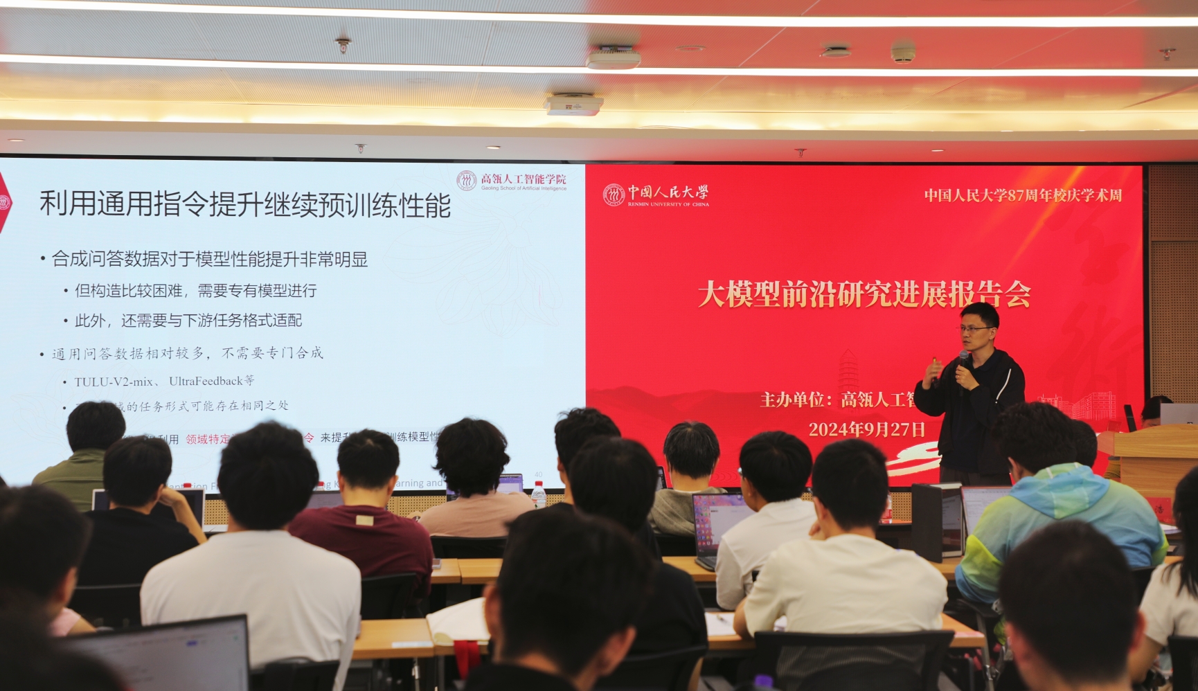 赵鑫教授分享了题为“面向大模型训练的数据工程方法”的主旨报告。他聚焦于预训练与继续预训练过程的基本技术路线,首先针对其中涉及的数据工程方法展开讨论。除了介绍如何高效利用已有数据外,还介绍了大规模合成数据在继续预训练中的应用方法。最后,以Llama 3为例,完整介绍了继续预训练所涉及的数据工程方法。