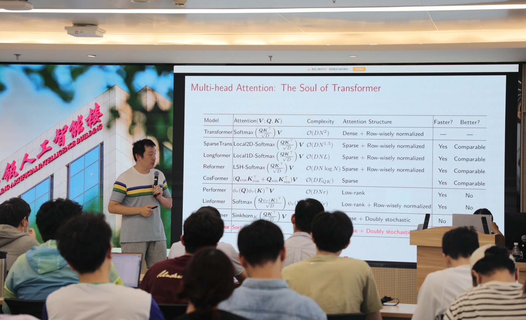 许洪腾长聘副教授分享了题为“算法驱动的高效模型架构设计与适配技术”的报告。他首先介绍了研究的初衷,希望挖掘传统算法在人工智能时代的作用,证明其在模型架构设计和适配方面的重要性。然后,他介绍了过去两年在这一方面的两个代表性工作,包括基于排序算法的新型注意力机制Sliceformer和基于Householder反射变换的模型轻量化适配技术,分别代表了离散算法和数值计算在人工智能领域的应用。这些工作不仅在理论上具有创新性,并且展示出在实际应用中的优良性能。其中,Householder反射适配的相关论文已经被NeurIPS2024录用为Spotlight paper。未来,他将同研究团队继续深挖算法驱动的模型架构设计这一方向。