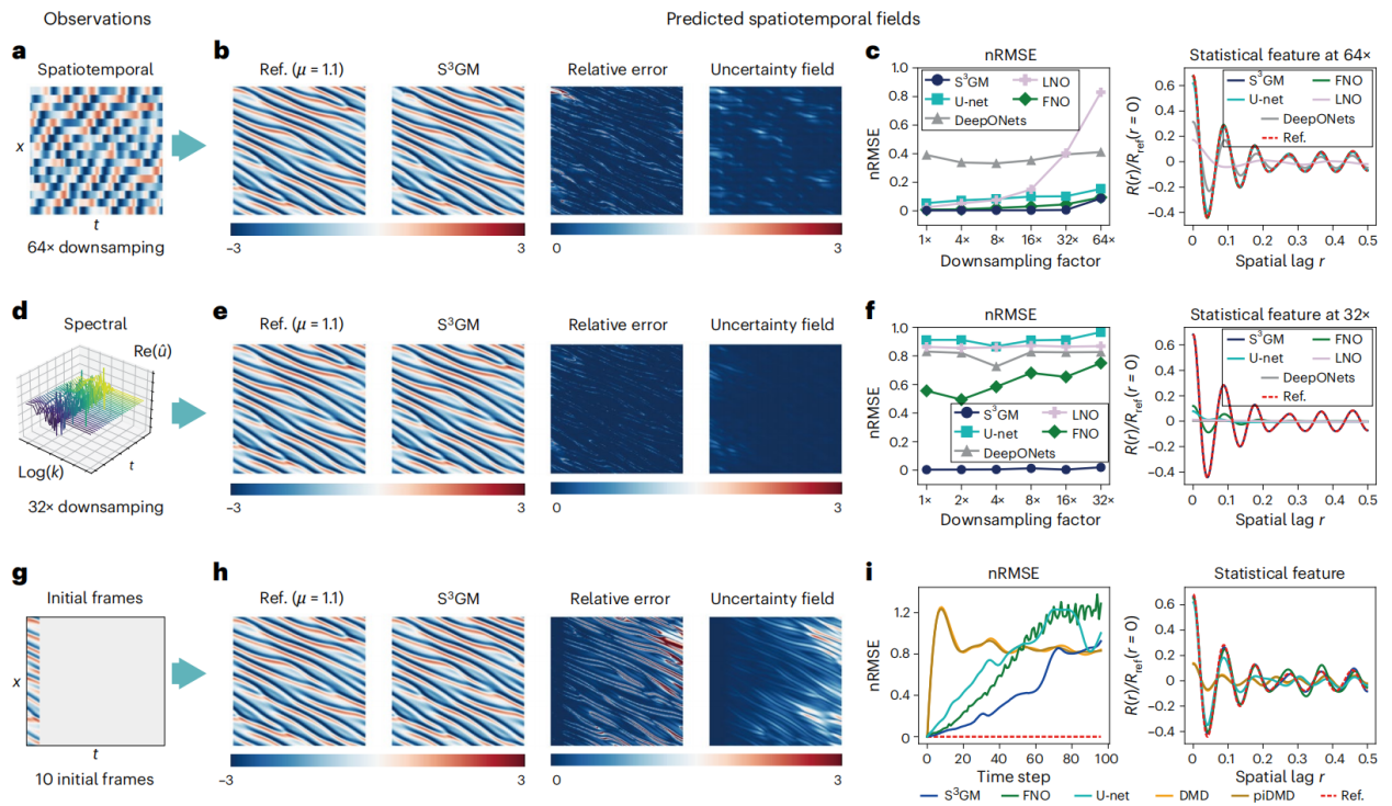 蘑菇视频 长聘副教授孙浩团队与北京航空航天大学杨立军教授团队合作,在Nature子刊Nature Machine Intelligence(《自然-机器智能》)发表题为“Learning spatiotemporal dynamics with a pretrained generative model”的Article文章,提出了一种基于扩散生成模型的动态系统预测算法,称为 S3GM(Sparse-Sensor-assisted Score-based Generative Model)。该方法融合了物理先验知识与实验测量数据,旨在解决现代科学与工程中的一大关键挑战:从稀疏的传感器测量数据中重建复杂的时空物理场。研究团队展示了 S3GM 即使在数据极为不完整和有噪声的情况下,也能够准确预测燃烧、流动、气候演变及其他众多物理系统的动态过程,为动力系统建模提供了新的思路。文章共同第一作者为李泽宇(北航)、韩旺(北航),共同通讯作者为孙浩(人大)、邓岳(北航)、杨立军(北航)。