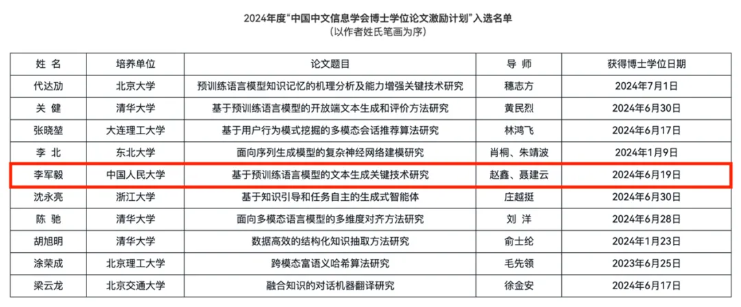 中国中文信息学会是中国科学技术协会下属的全国性学术团体,属于国家一级学会。其宗旨是促进计算机科学、语言文字学以及人工智能等相关学科的交叉融合与发展。为推动中国中文信息处理领域的科技进步,自2014年起,学会开始设立中国中文信息学会“博士学位论文激励计划”,旨在鼓励中文信息处理领域的博士研究生在读博期间面向前沿方向、立足原始创新、开拓进取,勇创世界领先的研究成果。2024年度,经多位专家评选,最终10篇论文入选 “博士学位论文激励计划”。