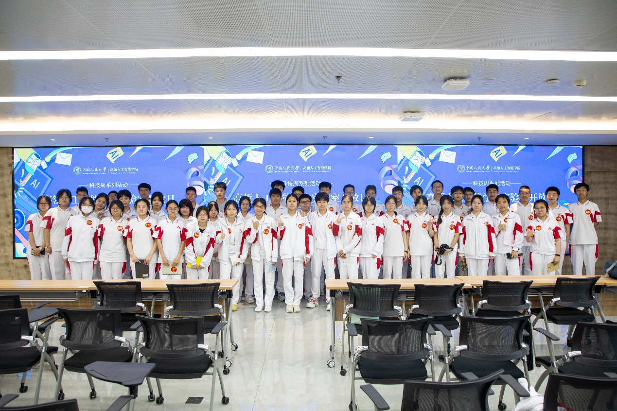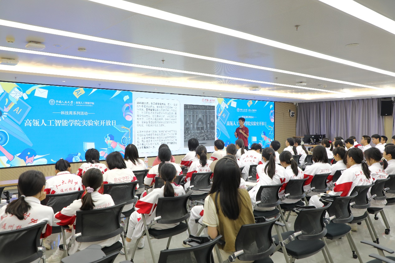 同学们首先参观了学院办学空间,随后走进师生日常工作的实验室,近距离感受大学生的日常学习科研生活。在学院报告厅,同学们了解了人大人工智能学科的发展历程及学院一系列人工智能前沿创新成果。