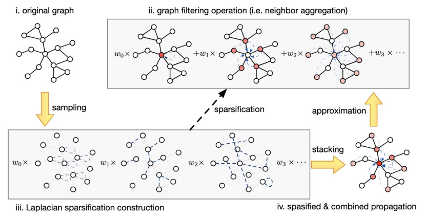 论文概述:近年来,图神经网络(GNN)在表示学习表现了非常优秀的效果,因而成为图上各类任务的重要模型。在多种GNN模型中,使用多项式滤波技术的谱域GNN在同配图和异配图任务上都表现出了可靠的效果。然而,谱域GNN的可扩展性由于其需要在多次图传播中学习多项式系数而受到限制。现有工作尝试通过删除输入节点特征后的线性层扩展谱域GNN,但这可能破坏端到端训练,可能影响性能,也可能无法完成高维度输入节点特征的训练。因此,我们提出了“使用拉普拉斯稀疏化的谱域图神经网络”。这是一种新的用于近似图传播特征的图谱稀疏化方法。我们证明了提出的模型可以生成拉普拉斯稀疏算子用于近似固定系数和可变系数的滤波器,并提供理论保证。我们的方法允许对输入节点特征使用线性层,保证了在处理纯文本输入特征时的端到端训练。我们的实验包含了多种图规模,多种不同的图性质,以证明我们提出模型的效率和效果。结果表明我们的模型可以在多种近似后模型上生成强于原模型的效果,以及在超大规模图 Ogbn-papers100M 和 MAG-scholar-C 上的可靠性。