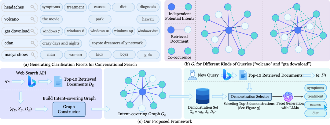 论文概述:搜索澄清是开放域对话式网络搜索中的关键用户界面,为模糊或多维度查询生成高质量分面能有效引导消歧并提升用户交互体验。近期,基于大语言模型(LLMs)的上下文学习通过利用静态或基于相似性的示例作为提示,已成为分面生成的重要方法。然而现有方法主要依赖查询相似性,未能考虑查询意图的多维特性,导致大语言模型可能生成与用户需求不符的错误或次优分面。为应对这一挑战,我们提出"意图覆盖"框架,通过选择能全面覆盖查询潜在多样意图的示例来改进澄清分面生成。具体而言:首先训练带束搜索的生成模型预测潜在意图,并构建意图-文档图以捕获语义关系;随后设计启发式贪心算法,通过最大化意图覆盖度优化示例选择;此外鉴于示例顺序对生成质量的重要影响,开发重排序模型优化示例序列以提升上下文对齐。实验表明,本方法在多种词汇和语义评估指标上均优于强基线模型。我们进一步深入分析了示例数量、顺序及上下文相关性对生成性能的影响机制。该研究为对话式搜索系统的澄清界面设计提供了新的技术路径和理论洞见。