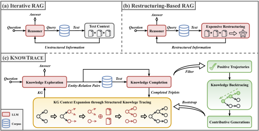 论文概述:近期在检索增强生成(RAG)领域的进展为大型语言模型(LLM)提供了迭代检索相关信息的能力,以处理复杂的多跳问题。这种方法交替进行LLM推理与信息检索,将外部信息积累到LLM的上下文。然而,随着上下文规模的增长,LLM识别关键信息片段及其潜在关联的难度不断增加,由此而产生的无效推理又会进一步加剧信息过载。针对这一挑战,本文提出了KnowTrace,一种创新的RAG框架,旨在有效缓解上下文过载,同时实现多步推理能力的自我提升。不同于简单堆积检索文本,KnowTrace采用一个独特的结构化知识追踪视角,通过自主追踪所需的知识三元组,组织与输入问题相关的特定知识图谱。这种结构化流程设计不仅为LLM提供了更加清晰的推理上下文,还自然衍生出一种知识回溯机制,能够识别对推理结果有实质贡献的生成内容,形成高质量的过程监督数据用以自我提升。大量实验表明,KnowTrace在三个标准多跳问答数据集上始终优于现有基线方法,并且其自我提升版本进一步放大了性能优势。
