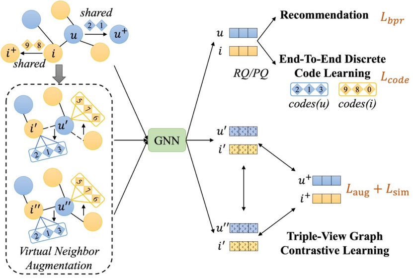 论文概述:图神经网络(Graph Neural Networks, GNN)因其能够捕捉高阶用户与物品之间的关系,在协同过滤(Collaborative Filtering, CF)中取得了显著进展。为了缓解数据稀疏性并提升表示学习效果,近年来研究者将对比学习(Contrastive Learning, CL)引入到图神经网络中。然而,现有方法在生成对比视图时往往通过对结构或表示的扰动,可能会破坏潜在的协同信息,从而降低正样本对齐的有效性。为了解决这一问题,本文提出了一种全新的图对比学习方法CoGCL。其核心思想是通过离散code增强对比视图中的协同信息。具体地,本文设计了一种端到端的多级向量量化器,用于将用户和物品的表示编码为包含协同语义的离散code。基于这些离散code,本文提出虚拟邻居增强和语义相关采样两种策略,分别在结构邻居和语义相似性两个层面构建更加可靠和信息丰富的对比视图。最终,本文将上述增强方法融合为一个三视图的图对比学习框架,有效提升了推荐性能。在四个公开数据集上的实验结果验证了CoGCL的优越性。