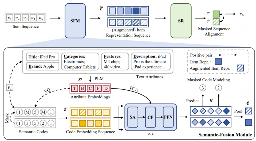 论文概述:近年来,大量研究致力于通过将丰富的辅助信息与基于ID的协同信息相结合来增强序列推荐系统。本研究特别关注如何利用与物品相关的文本元数据(如标题和品牌)。尽管现有方法通过融合文本表征与ID表征取得了显著成果,但这些方法往往难以在文本表征所嵌入的语义信息与用户行为序列模式中隐含的协同信息之间实现有效平衡。为此,我们提出了基于语义ID的文本与协同语义融合序列推荐方法(CCFRec)。该方法的核心理念是利用语义ID作为桥梁来弥合文本信息与协同信息之间的语义鸿沟。具体而言,我们通过向量量化技术从多视角文本嵌入中生成细粒度语义ID,继而利用基于交叉注意力机制的语义融合模块来灵活地从文本表征中提取并整合语义信息。为进一步加强文本语义与协同语义的融合,我们提出采用掩码技术的优化策略,该策略包含两个特定目标:掩码预测建模与掩码序列对齐。这些目标通过掩码预测任务和增强的物品表征,既能捕捉单个物品内部的语义ID关联,又能强化推荐主干网络的序列建模能力。在四个公开数据集上的大量实验表明,CCFRec具有显著优越性,其性能明显超越现有主流序列推荐模型。