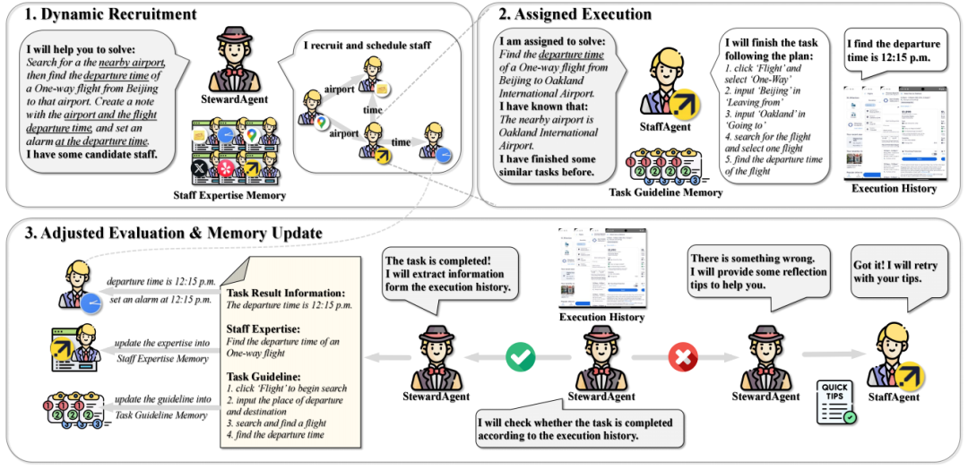 论文概述:Mobile Agent能够帮助人们自动化完成手机上的日常任务,已成为一个重要的研究热点。然而,目前采用面向过程设计的Agent在处理跨应用指令时面临诸多挑战,包括:(1)任务关系复杂;(2)应用环境多样化;(3)多步骤执行中的错误传播和信息丢失。受面向对象程序设计的启发,我们提出了一个名为 MobileSteward 的自进化多智能体框架,该框架整合了多个面向应用的 StaffAgents,由一个中心化的 StewardAgent 协调。 MobileSteward 中设包含三个模块:(1)动态招募(Dynamic Recruitment)通过信息流引导生成调度图,关联不同应用之间的任务;(2)分配执行(Assigned Execution)将任务分配给面向应用的 StaffAgents,每个 StaffAgent 都配备特定应用的专业知识,以应对应用之间的多样性;(3)调整评估(Adjusted Evaluation)进行评估,提供反思建议或传递关键信息,从而缓解多步骤执行中的错误传播和信息丢失。为了持续提升 MobileSteward 的性能,我们开发了一种基于记忆的自进化机制,该机制总结成功执行的经验,以优化 MobileSteward 的性能。我们在真实环境中建立了第一个英文跨应用基准测试(CAPBench),用于评估Mobile Agent解决复杂跨应用指令的能力。实验结果表明,MobileSteward 在单智能体和多智能体框架中均表现出色,凸显了其在处理复杂多样的用户指令方面的优越性。