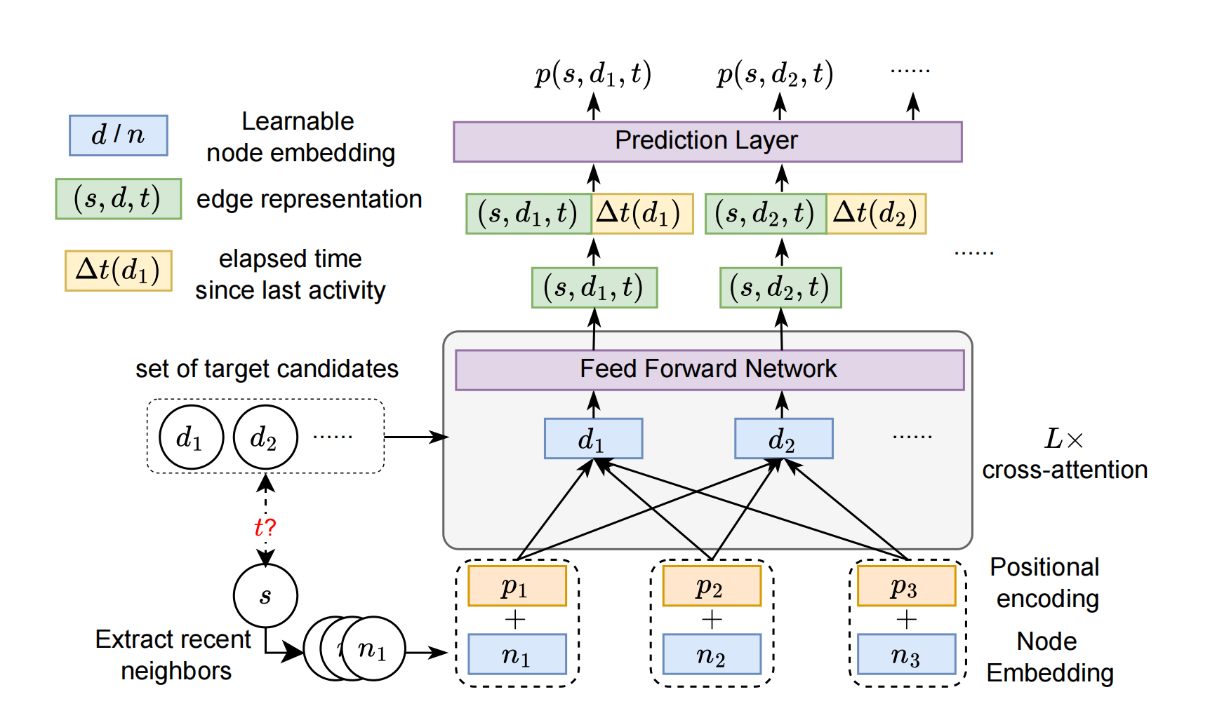 论文概述:本研究围绕时序图中的未来链接预测问题展开,该任务在诸多动态系统中具有重要应用价值。现实场景中常同时包含重复出现的(已见)与新颖的(未见)交互关系,这对模型的泛化能力提出了更高要求。然而,现有方法普遍依赖复杂的记忆与聚合模块,难以有效处理未见边的预测问题。针对这一挑战,我们重新审视了当前时序图模型的架构,提出未来链接预测中两个被忽视但至关重要的建模需求:一是以唯一标识符表征节点,二是执行源节点与候选目标节点之间的目标感知匹配机制。在此基础上,我们提出了一种基于交叉注意力机制的时序图未来链接预测方法CRAFT(Cross-Attention based Future Link Predictor on Temporal Graphs)。该方法舍弃了传统的记忆与聚合结构,仅由两个核心组件构成:可学习的节点嵌入表示,以及目标节点与源节点近期交互之间的交叉注意力机制。CRAFT架构不仅具有较强的表达能力,还实现了基于交互模式的目标感知建模。在多个真实数据集上的实验结果表明,CRAFT在保持高效性的同时,取得了显著优于现有方法的预测性能,显示出其在大规模应用场景中的广泛适用性。