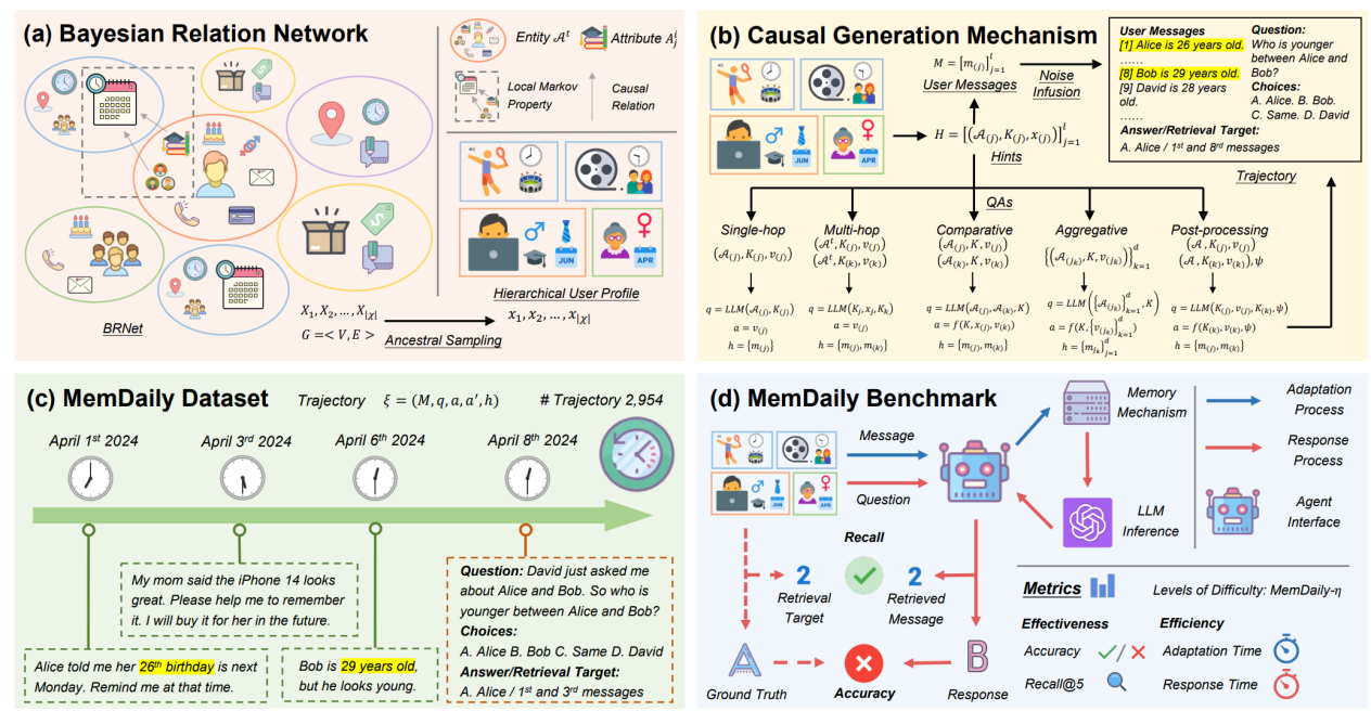 论文概述:基于大语言模型的智能体已被广泛应用于个人助理领域,能够记忆用户消息中的信息并回应个人查询。然而,对其记忆能力的客观和自动化评估仍然缺乏,这主要归因于根据用户消息构建可靠问答对的挑战。在本文中,我们提出了MemSim,这是一个贝叶斯仿真器,旨在从生成的用户消息中自动构建可靠的问答对,同时保持其多样性和可扩展性。具体而言,我们引入了贝叶斯关系网络(BRNet)和因果生成机制,以减轻大语言模型幻觉对事实信息的影响,促进评估数据集的自动创建。基于MemSim,我们在日常生活场景中生成了一个名为MemDaily的数据集,并进行了大量实验以评估我们方法的有效性。我们还基于MemDaily数据集为评估基于大语言模型智能体中不同记忆机制提供了一个基准。