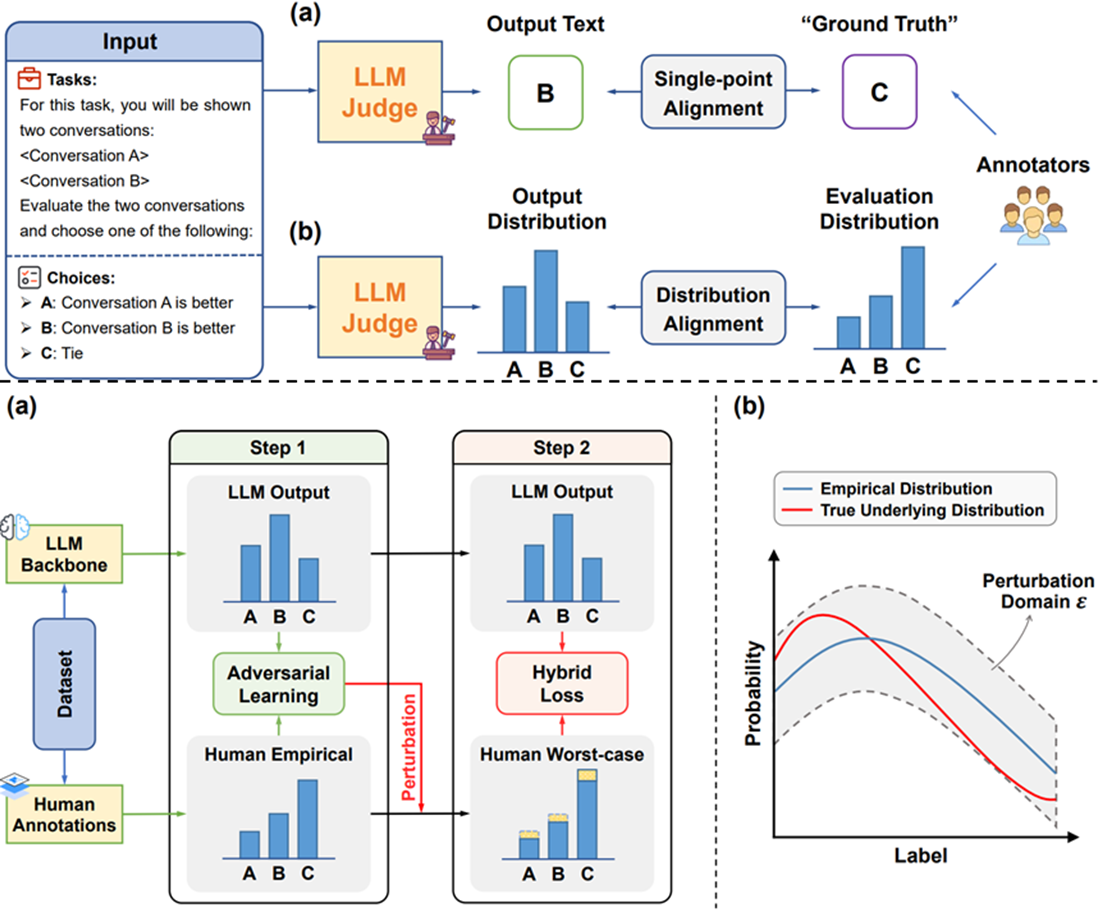 论文概述:传统的LLM-as-a-Judge倾向于给出一个单一的评估结果,例如为一段文本评定一个绝对分数,但这与真实人类评估中所蕴含的丰富多样性与不确定性相悖(不同评估者可能会给出不同的打分)。这种简化处理削弱了评估结果的可靠性。为解决此问题,本研究开创性地提出了一个新颖的训练对齐框架,旨在将LLM生成的评估结果的分布与真实的人类评估的分布进行显式对齐。我们的核心方法是设计一个基于KL散度的分布对齐目标函数,并辅以交叉熵正则化来稳定训练过程。此外,考虑到实际应用中人类标注数据可能有限或存在噪声,我们进一步引入了对抗训练来提升模型在分布对齐过程中的鲁棒性。实验结果表明,在多种模型和评估任务上,我们的框架在对齐质量、评估准确性和鲁棒性方面均显著优于现有的闭源大语言模型以及传统的单点对齐方法。