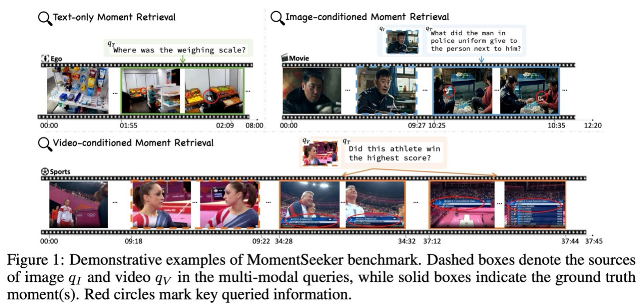 论文概述:准确识别长视频中的关键片段对于解决长视频理解任务具有重要意义。然而,现有基准测试存在明显局限性:要么受限于视频长度和任务多样性,要么仅关注端到端的整体性能,无法有效评估关键片段的定位准确性。为解决这一问题,我们提出了一个专为长视频片段检索设计的新型基准测试系统,MomentSeeker,其创新特性包括:首先,基于平均时长超过1200秒的多领域长视频构建,涵盖电影、异常监控、第一人称视角和体育等多样化场景;其次,设计了三层级的现实场景评估框架(全局层级、事件层级和对象层级),包含动作识别、物体定位和因果推理等常见任务;最后,支持文本查询、图像条件查询和视频条件查询等多模态检索方式。基于该基准测试,我们分别对生成式方法(直接使用多模态大语言模型)和检索式方法(结合视频检索器)进行了全面评估。实验表明,尽管最新长视频MLLMs和任务特异性微调技术有所进步,但长视频片段检索在准确性与效率方面仍面临重大挑战。目前我们已开源MomentSeeker数据集以及代码,以促进该领域的深入研究。