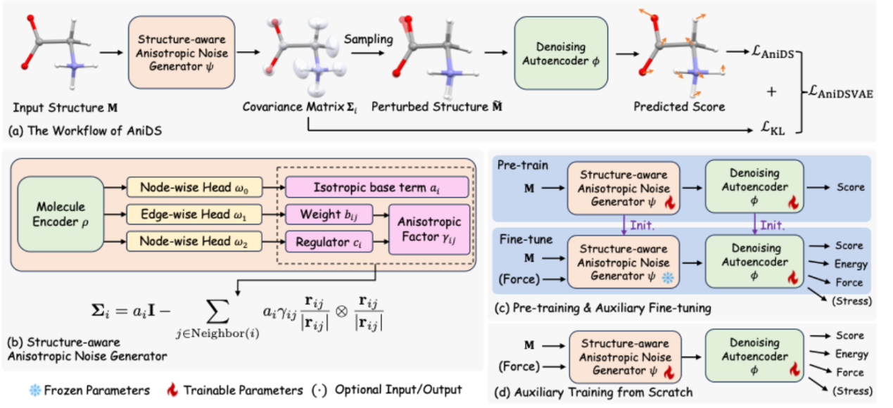 论文概述:坐标去噪因其在理论上与分子力场学习的紧密联系,已成为三维分子预训练中的一种有前景的方法。然而,现有的去噪方法依赖于过于简化的分子动力学假设,认为原子运动是各向同性且同方差的。为克服这些局限,我们提出了一种全新的去噪框架 AniDS:各向异性变分自编码器(Anisotropic Variational Autoencoder)用于三维分子去噪。AniDS 引入了一种结构感知的各向异性噪声生成器,能够为高斯噪声分布生成基于原子的完整协方差矩阵,从而更好地反映分子体系中方向性和结构上的差异。这些协方差通过原子对之间的相互作用计算而来,作为对各向同性基底的各向异性修正。我们的设计保证了生成的协方差矩阵在数学上是对称的、半正定的,并满足 SO(3) 等变性,同时具备更强的建模复杂分子动力学的能力。大量实验表明,AniDS 在 MD17 和 OC22 基准测试中显著优于此前的各向同性、同方差去噪模型以及其他领先方法,在力预测精度上分别取得了 8.9% 和 6.2% 的平均相对提升。进一步的晶体结构案例研究表明,AniDS 能够自适应地在化学键方向上抑制噪声,这与物理化学原理高度一致。