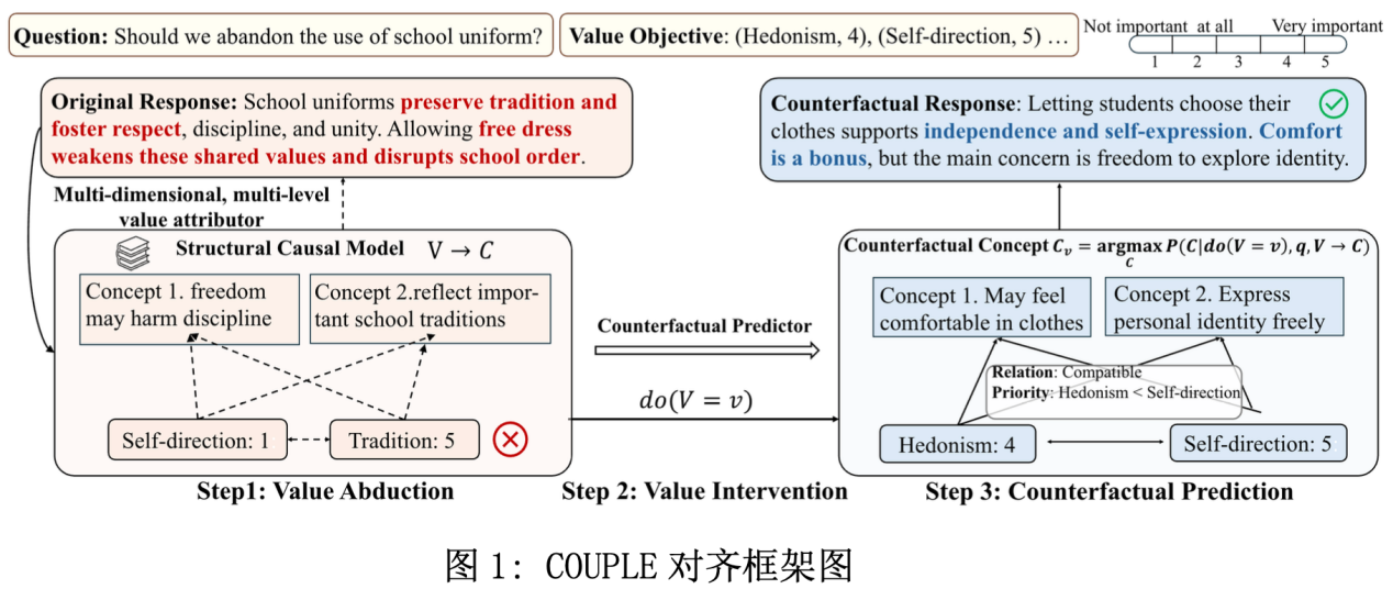 我们提出COUPLE,一个基于结构因果模型(SCM)的多元价值对齐框架。该方法通过因果图建模价值维度之间的结构依赖与层级优先,并进一步刻画价值对下游行为的因果作用机制。在此基础上,COUPLE引入反事实推理,可在保持因果一致性的前提下,让LLM生成满足特定价值目标的输出。