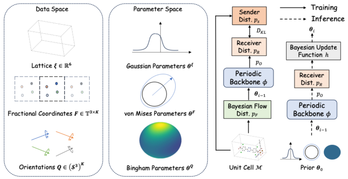 论文概述:金属有机框架(Metal-Organic Frameworks, MOFs)因其独特的性质——包括高比表面积和可调控的孔隙率——而受到广泛关注,并在催化、气体储存和药物递送等领域展现出巨大应用潜力。MOFs 的结构预测是一项具有挑战性的任务,因为这类框架本质上具有周期性和层级性,其整体结构由金属节点和有机连接体等基本单元拼装而成。为解决这一问题,我们提出了一种新型生成模型 MOF-BFN,基于贝叶斯流网络(Bayesian Flow Networks, BFNs)进行 MOF 结构预测。该模型在给定基本单元的局部几何信息的条件下,可以联合预测晶格参数以及晶胞内所有基本单元的位置和取向。具体而言,位置采用分数坐标系建模,从而自然地融入周期性;而取向则表示为单位四元数,并通过所提出的 Bingham BFN 从学习得到的 Bingham 分布中采样,从而实现了在四维单位超球面上的有效取向生成。实验结果表明,MOF-BFN 在多个任务中均达到了当前最先进的性能,包括结构预测、几何性质评估以及全新生成。这为复杂 MOF 材料的设计提供了一种有前景的工具。