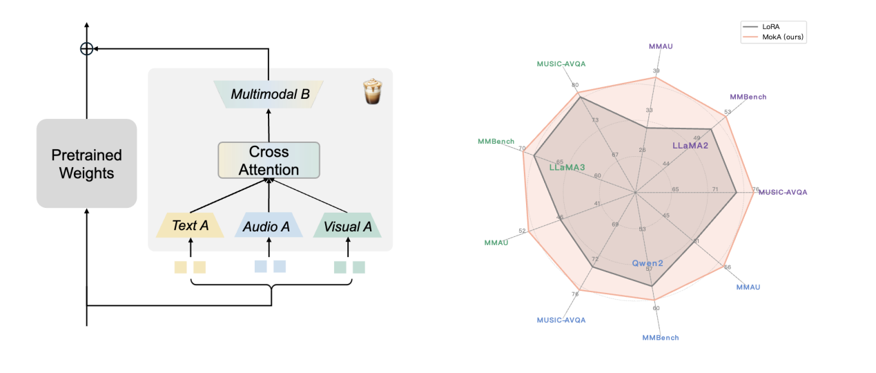 论文概述:当下,一般MLLMs微调方案大多简单的将单模态策略迁移至多模态场景,未结合多模态学习特性进行深入思考。我们认为多模态微调不仅需要考虑模态间交互,也需要考虑单模态特性。为此,在最近的工作中,我们以一种新的视角来反思多模态微调的基本逻辑,最终形成了简单高效的MokA微调方案,同时保证单模态与跨模态adaptation,更加适合多模态场景。MokA结合不同基座模型在多个多模态场景下都相比统一处理范式取得了更优的结果。