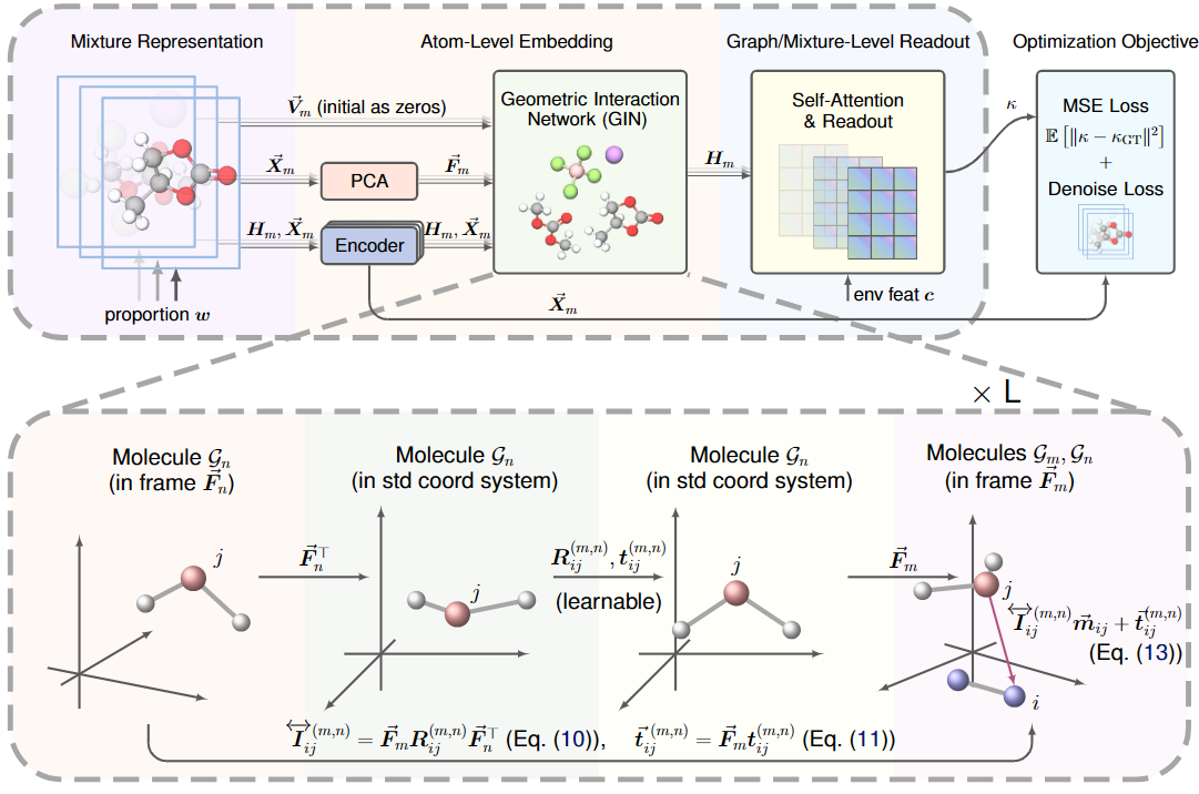 论文概述:准确预测电解质体系中的离子电导率,对于推动众多科学与技术应用的发展至关重要。尽管已有显著进展,当前研究仍面临两大根本性挑战:(1)缺乏高质量的标准化基准数据集;(2)对混合体系中分子几何结构及分子间相互作用的建模不足。为解决这些问题,我们首先重新整理并改进了CALiSol和DiffMix两个电解质数据集,通过引入分子的几何图表示来增强其信息表达。随后,我们提出了GeoMix——一种新颖的、具备几何感知能力的框架,该框架保持了Set-SE(3)等变性,这一特性在混合体系建模中至关重要但实现难度较高。GeoMix的核心是几何交互网络,这是一种专为分子间几何信息传递设计的等变模块。大量实验表明,GeoMix在两个数据集上均优于多种基线模型,验证了跨分子几何相互作用和等变信息传递在准确预测体系性质方面的重要性。本研究不仅为电解液研究建立了新的基准,还提供了一个通用的几何学习框架,有望推动能源材料、药物研发等领域中混合体系的建模。