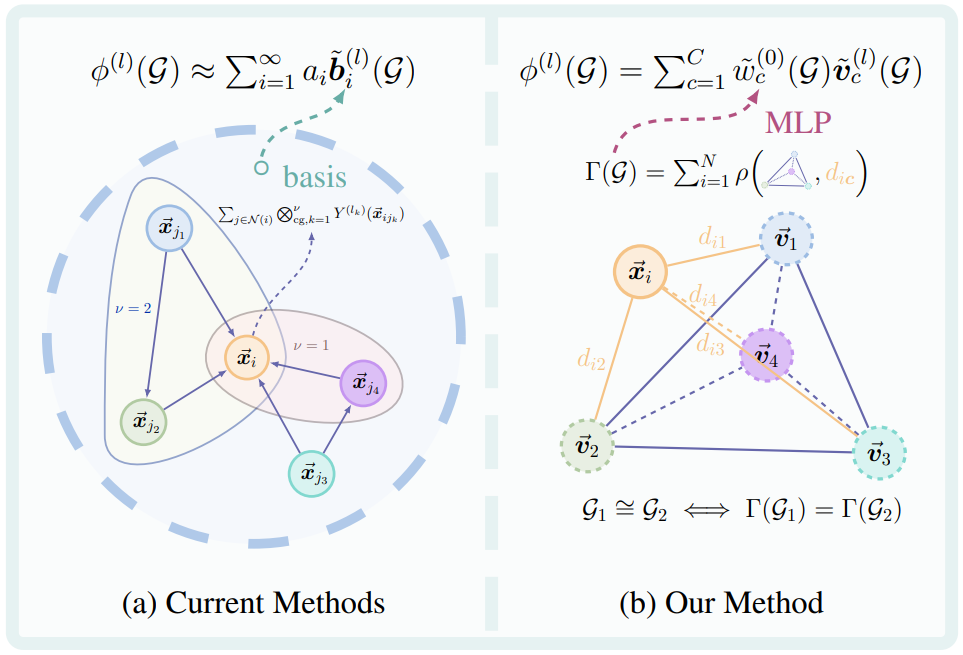 论文概述:等变图神经网络(Equivariant Graph Neural Networks, GNNs)在多种应用中已展现出显著成功。为了实现完备性——即在等变函数空间上的通用逼近性质——网络必须能够有效捕捉不同节点之间复杂的多体相互作用。以往的方法通常通过加深网络结构、提高交互阶数或增加可导向特征的维度来实现,但往往伴随着巨大的计算开销,且缺乏多项式时间的解法。在本文中,我们提出了一个具有坚实理论基础的框架,用于构建既高效又实用的完备等变图神经网络。我们证明了:只需两个关键组成部分就能实现完备的等变图神经网络——1)一个完备的标量函数,被称为几何图的标准型;2) 一个满秩的可操控基集合。基于这一发现,我们提出了一种高效算法,能够利用两类常见模型(EGNN 和 TFN)来构建完备的等变图神经网络。实验结果表明,我们的模型在仅使用少量层数的情况下,便能实现更强的完备性与优异的性能,从而显著降低计算开销,同时保持良好的实用效果。