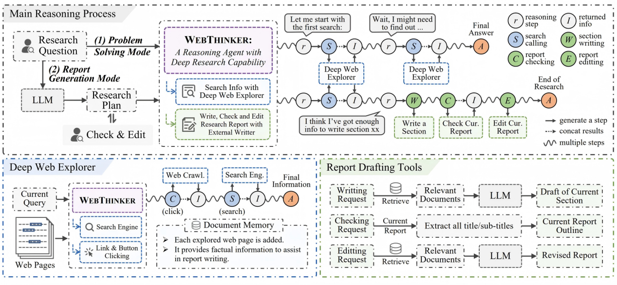 论文概述:大型推理模型(如OpenAI-o1和DeepSeek-R1)在长程推理任务中展现出卓越的能力,但其性能受限于对静态内部知识的依赖,尤其在处理复杂知识密集型任务或生成需综合多源网络信息的全面研究报告时表现不足。针对这一问题,本文提出WebThinker——一种具备深度研究能力的智能体系统,能够在推理过程中自主边思考、边搜索、边写作,来端到端完成一整个研究任务。该系统集成了“深度网络探索器”模块,使模型能够动态检索、遍历和提取网络信息以弥补知识缺失;同时采用“自主思考-搜索-起草”策略,实现推理、信息获取与报告撰写的无缝协同。为进一步优化研究工具的使用效果,我们还提出一种基于强化学习的训练策略,通过迭代式在线直接偏好优化(DPO)提升模型对工具的调用能力。在多个复杂推理基准(包括GPQA、GAIA、WebWalkerQA和HLE)以及科学报告生成任务(Glaive)上的实验表明,WebThinker显著优于现有方法及主流闭源系统,有效提升了推理模型在复杂场景下的可靠性,为构建更强大、更通用的深度研究系统奠定了基础。相关代码已开源://github.com/RUC-NLPIR/WebThinker。
