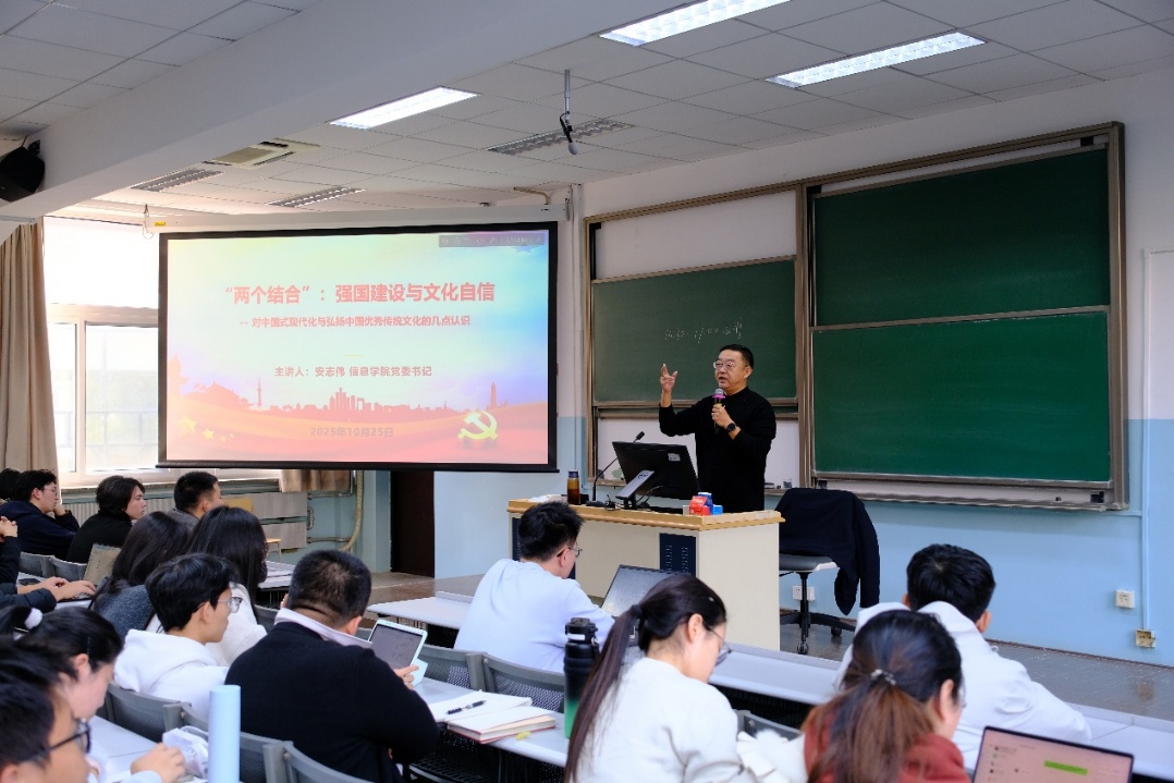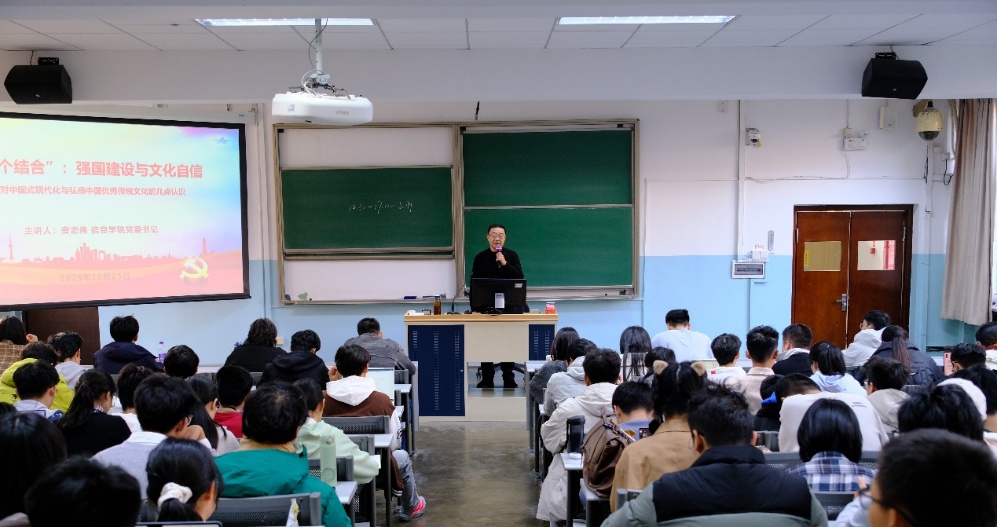 10月25日下午,蘑菇视频 第2期入党积极分子培训班第二次党课顺利举行。本次党课联合信息学院,邀请信息学院党委书记安志伟,以“‘两个结合’:强国建设与文化自信”为主题,为全体学员带来一堂兼具理论深度与现实关怀的专题党课。课程围绕党的创新理论、中国式现代化路径与中华文化精神内核展开,引导学员增强理论认同、树立强国志向、筑牢文化根基,激励大家以“复兴栋梁,强国先锋”为使命,在专业学习与人生发展中践行初心、担当重任。