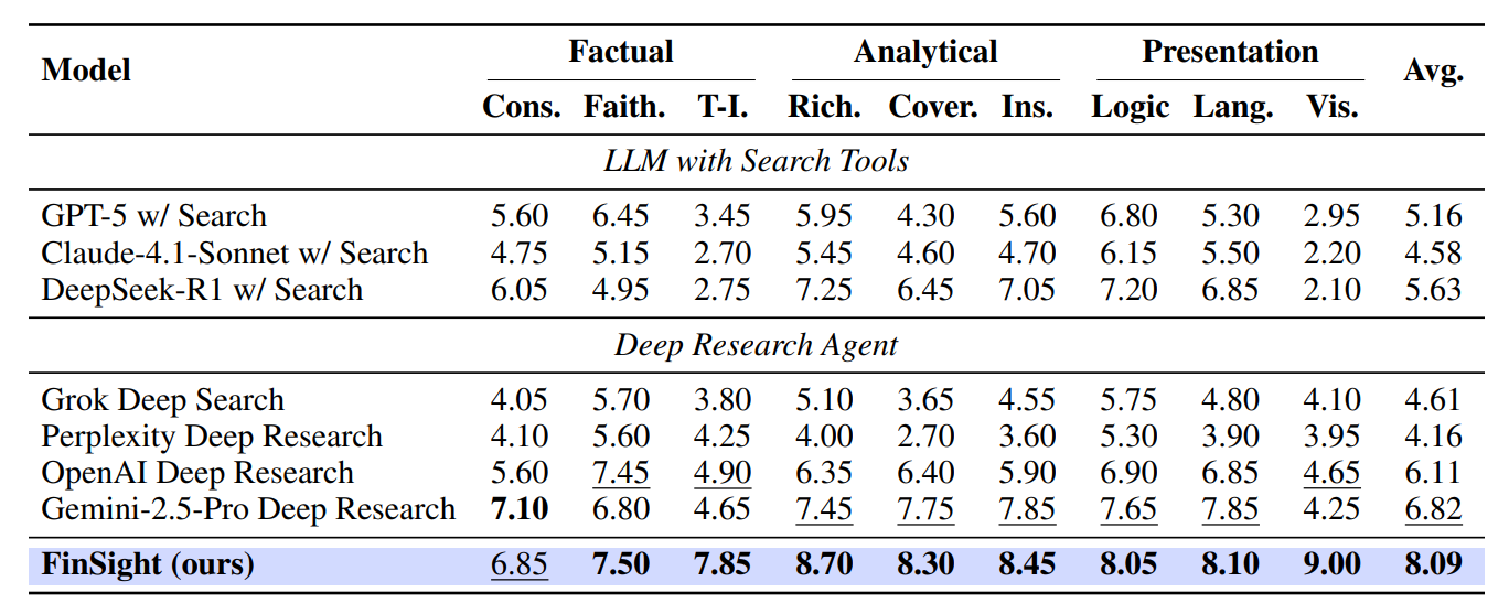 该系统不仅斩获了 AFAC2025 金融智能创新大赛挑战组冠军(1289支队伍中排名第一),更在多项评测中超越了 GPT-5 w/Search、OpenAI Deep Research 和 Gemini-2.5-Pro Deep Research 等顶尖系统。FinSight通过设计的 “代码驱动可变内存(CAVM)”架构和“迭代式视觉增强”机制,实现了从数据收集、深度分析到图文并茂报告生成的全流程自动化。