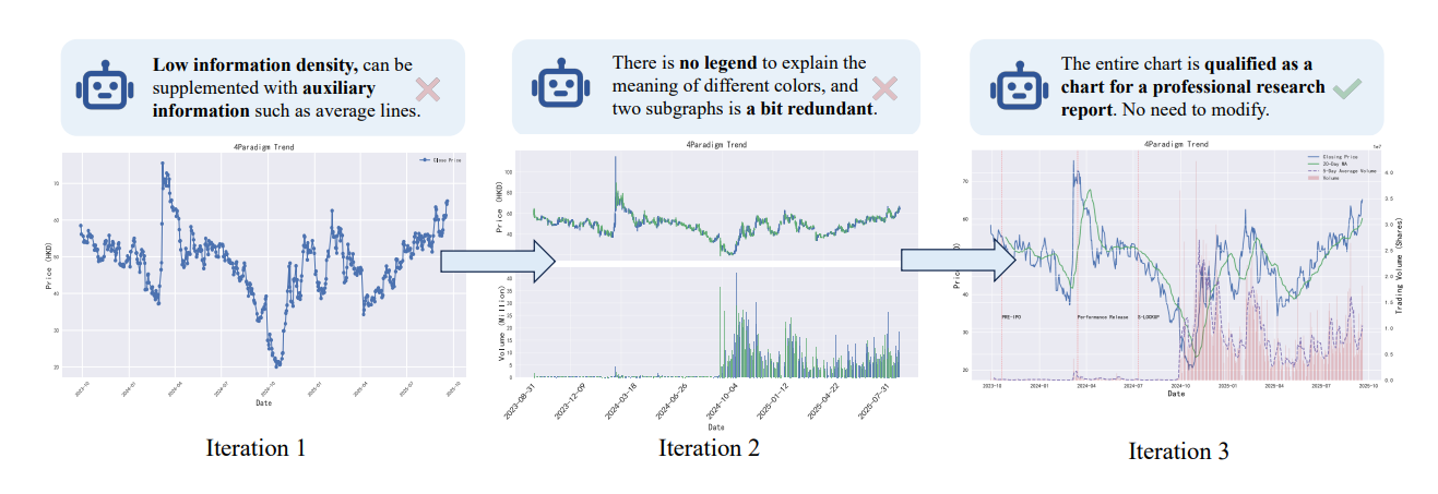 2. 视觉突破:迭代式视觉增强机制 (Iterative Vision-Enhanced Mechanism) 针对现有 AI 生成图表往往“不专业、不美观”的通病,FinSight 引入了 Actor-Critic(行动者-评论家) 协作机制。在这一机制中,大语言模型(LLM)作为“行动者”负责编写绘图代码,而视觉语言模型(VLM)则担任“评论家”,从数据准确性、标签清晰度及整体美观度等多个维度提出修改建议。系统通过“生成-评估-修正”的闭环迭代,能够将初版草图逐步打磨成达到出版级别的专业金融图表,实现了真正的图文并茂。