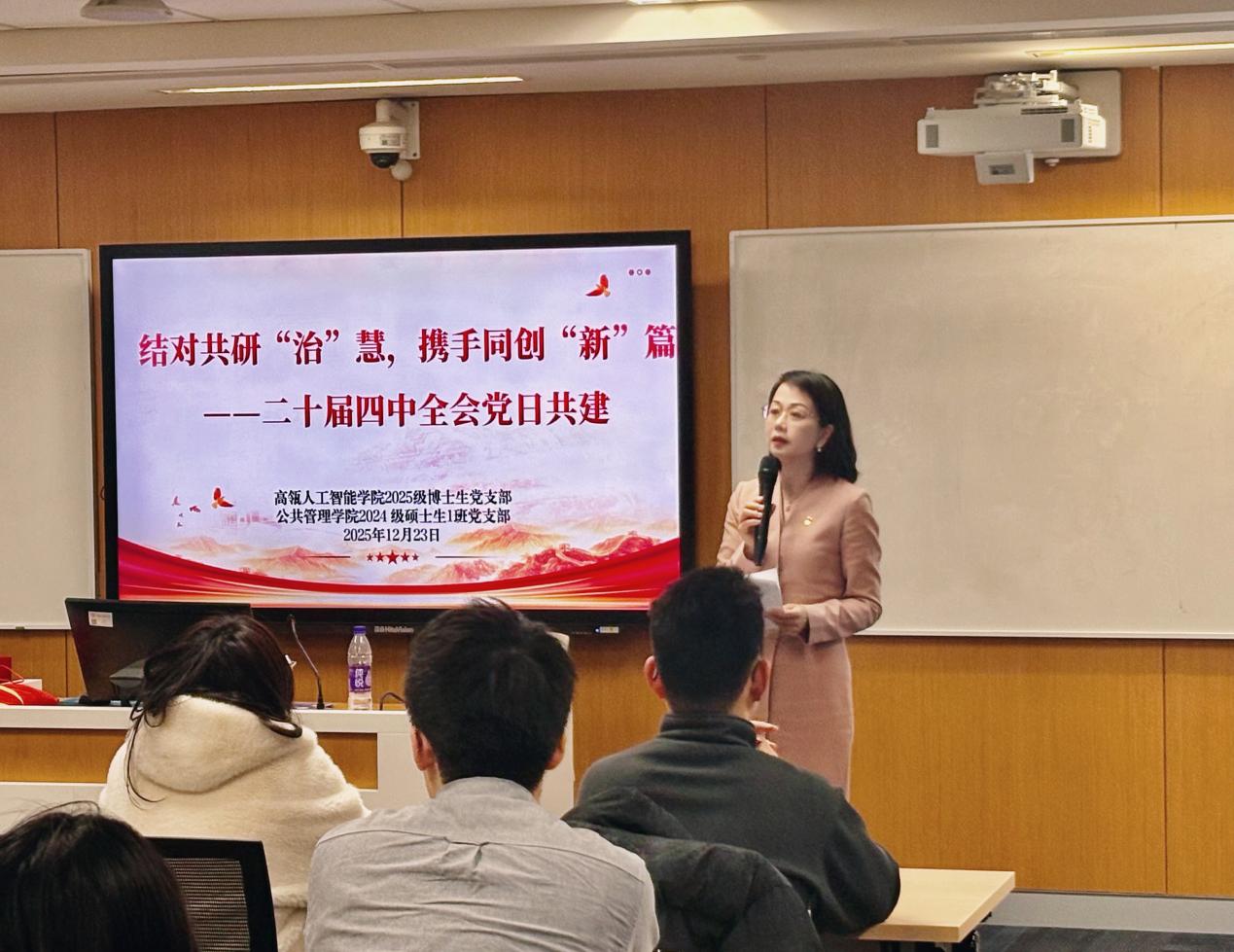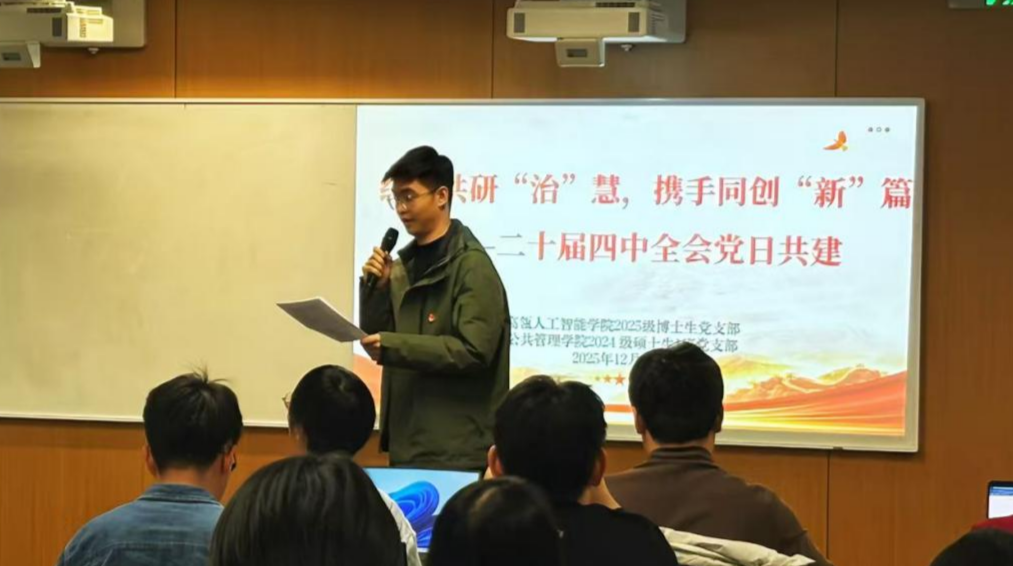 12月23日晚,由蘑菇视频 2025级博士生党支部与公共管理学院2024级硕士生1班党支部共同主办的“结对共研‘治’慧,携手同创‘新’篇——党的二十届四中全会党日共建”活动在立德楼1002教室举办。蘑菇视频 党委书记李艳丽、团委书记任安兴参加活动。本次活动由蘑菇视频 2025级博士生党支部书记包增浩主持。两个支部的党员、入党积极分子齐聚一堂,通过跨越本硕博三个学段和跨学科的交流碰撞,深入学习贯彻党的二十届四中全会精神,共同探讨人工智能与国家治理现代化的深度融合。