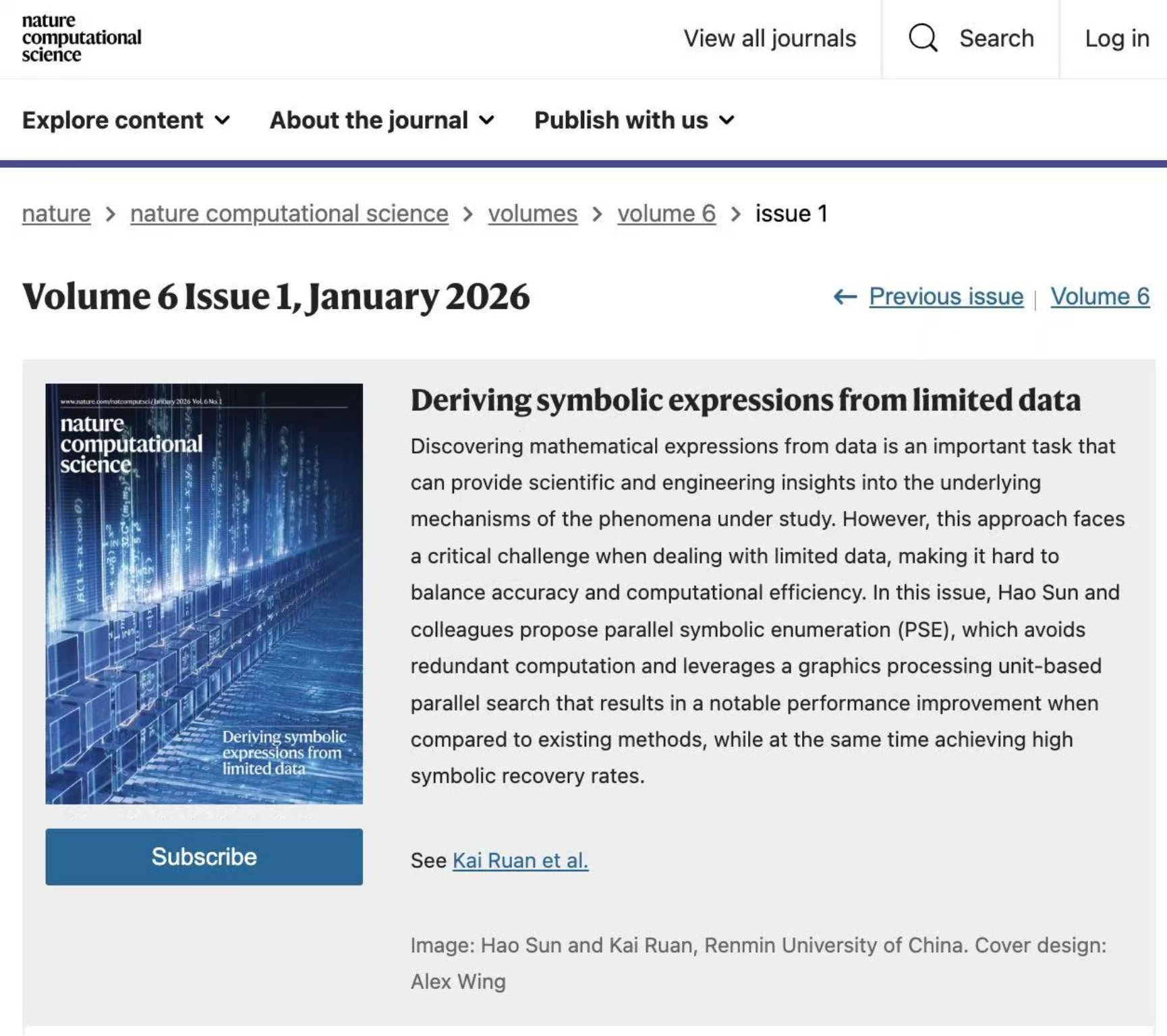 近期,蘑菇视频 孙浩教授团队在Nature子刊《自然-计算科学》(Nature Computational Science)发表了题为“Discovering physical laws with parallel symbolic enumeration”的研究论文,被该期刊选为2026年首期封面文章(Volume 6,Issue 1)。