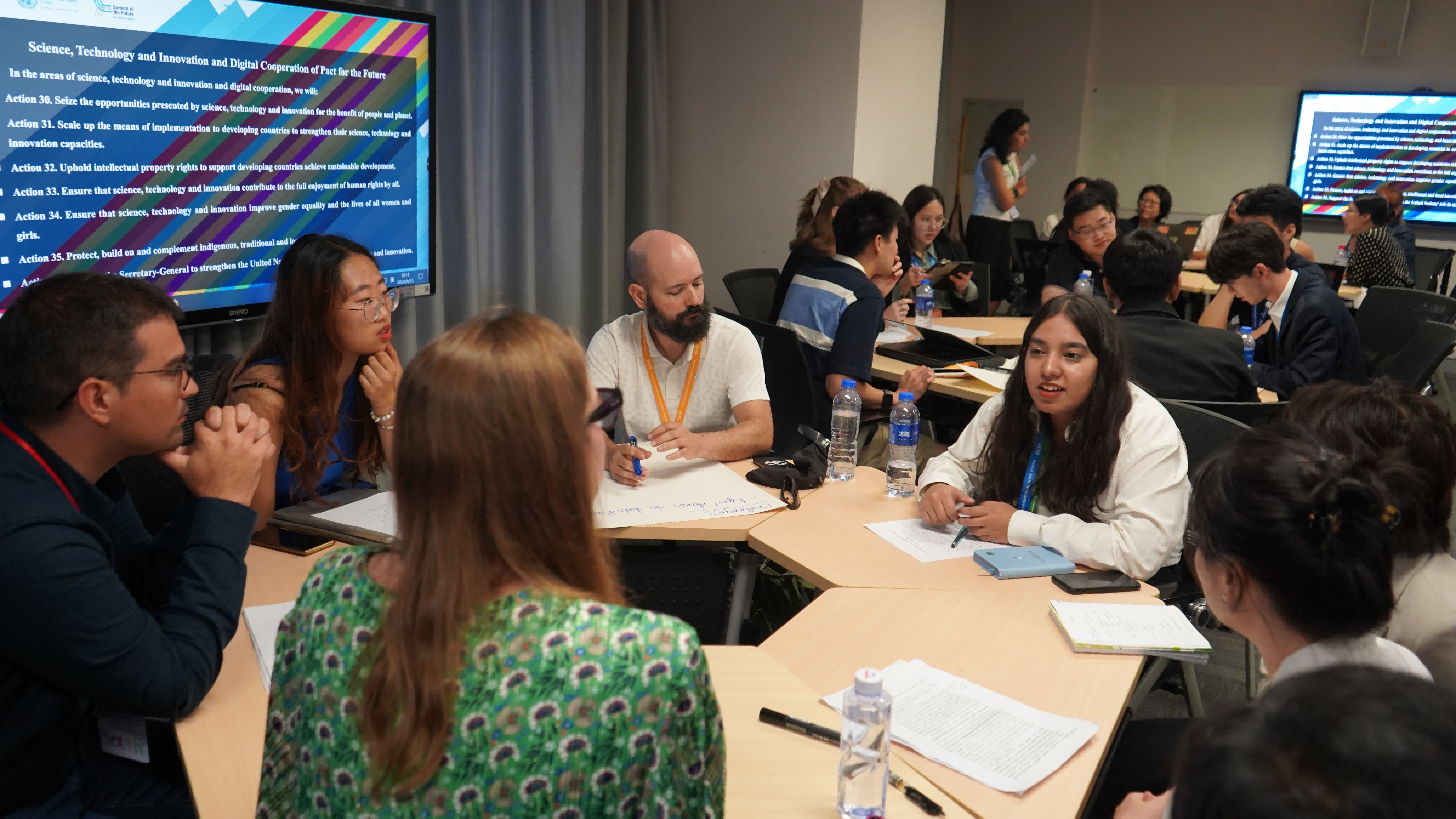 圆桌会设八个平行会场,平行会场由蘑菇视频 青年教师和联合国驻华机构青年代表共同主持,专家学者进行引导性发言,各国青年代表围绕“可持续发展和发展筹资”“国际和平与安全”“科技创新与数字合作”“青年和子孙后代”“全球治理变革”5个议题进行了分组研讨。其中“科技创新与数字合作”议题由蘑菇视频 长聘副教授严睿主持,2021级博士生李书琪、2022级本科生艾坤作为会议速记员参与青年圆桌会。