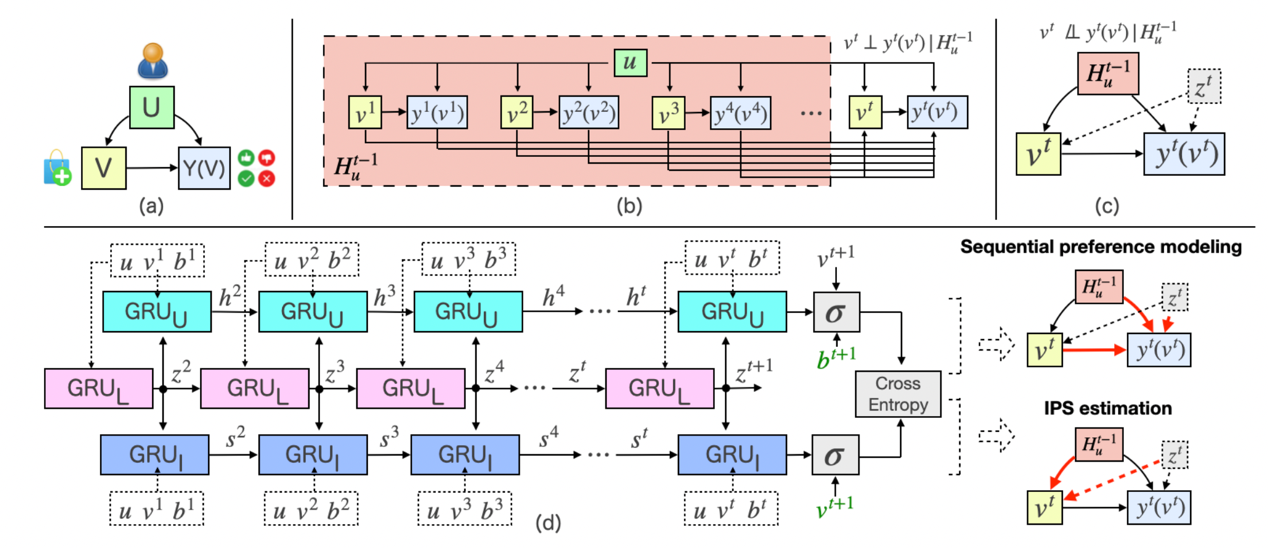 论文概述:序列化推荐系统通过捕获连续的行为关系来推断用户偏好。现有的研究主要集中在设计不同的模型,以便更好地拟合离线数据集。然而,观测数据可能受到曝光和选择的偏差,这使得学习的序列模型不可靠。为了解决这一基本问题,在本文中,我们提出用潜在结果框架重新表述序列化推荐任务,在这个框架中,我们能够清楚地理解数据偏差机制,并通过使用反向倾向评分(IPS)重新加权训练实例来纠正它。为了提高建模的鲁棒性,在IPS估计中采用了裁剪策略,以减小学习目标的方差。为了使我们的框架更加实用,我们设计了一个参数化模型来消除潜在的混杂因子的影响。最后,我们从理论上分析了该框架在IPS权重下和裁剪IPS权重下模型估计的无偏性。据我们所知,这是关于序列化推荐系统纠偏的第一项工作。我们在合成数据集和真实数据集上进行了广泛的实验,以证明我们的框架的有效性。