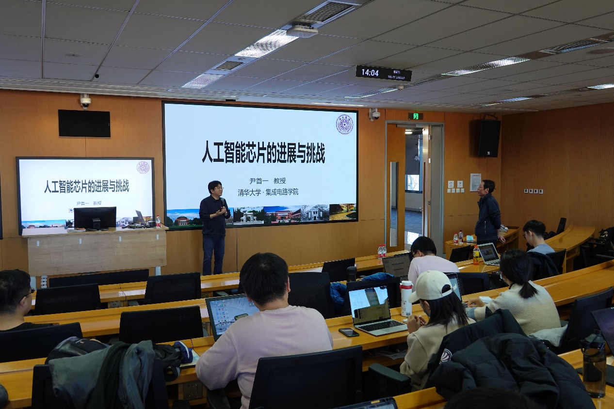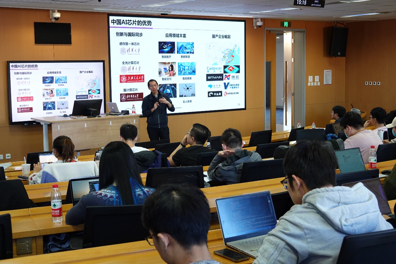在问答环节,与会师生就AI芯片的不同类别,及国内AI芯片企业的发展境况,围绕“国内人工智能芯片的瓶颈”,“存内计算处理器中使用物理定律对于较大的数值问题可能会存在电流过大而引起发热问题以及能耗问题”,“模型压缩方向如何落地芯片底层设计”等问题与主讲嘉宾进行了讨论。尹首一教授表示,影响国内AI芯片发展的因素很多,特别是国外上层生态结构会导致发展受限、难以超越的情况;存内计算存储器中的物理规律存在的精度和能耗问题目前是研究热点AI部分应用具有一定的容错性,也使得存内计算存储器的应用成为了可能;从模型压缩与底层融合的角度来说,应从体系相关入手,将模型理论与体系结构设计相结合。