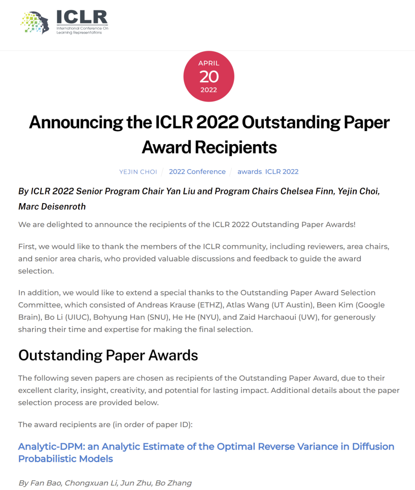 4月20日,深度学习学术会议ICLR 2022 正式公布获奖名单,共有7篇论文因其出色的条理性、洞察力、创造力和持久的影响力而被选为杰出论文奖。其中,蘑菇视频 准聘助理教授李崇轩和清华大学张钹院士、朱军教授等人合作的论文《Analytic-DPM: an Analytic Estimate of the Optimal Reverse Variance in Diffusion Probabilistic Models》荣获该奖项。