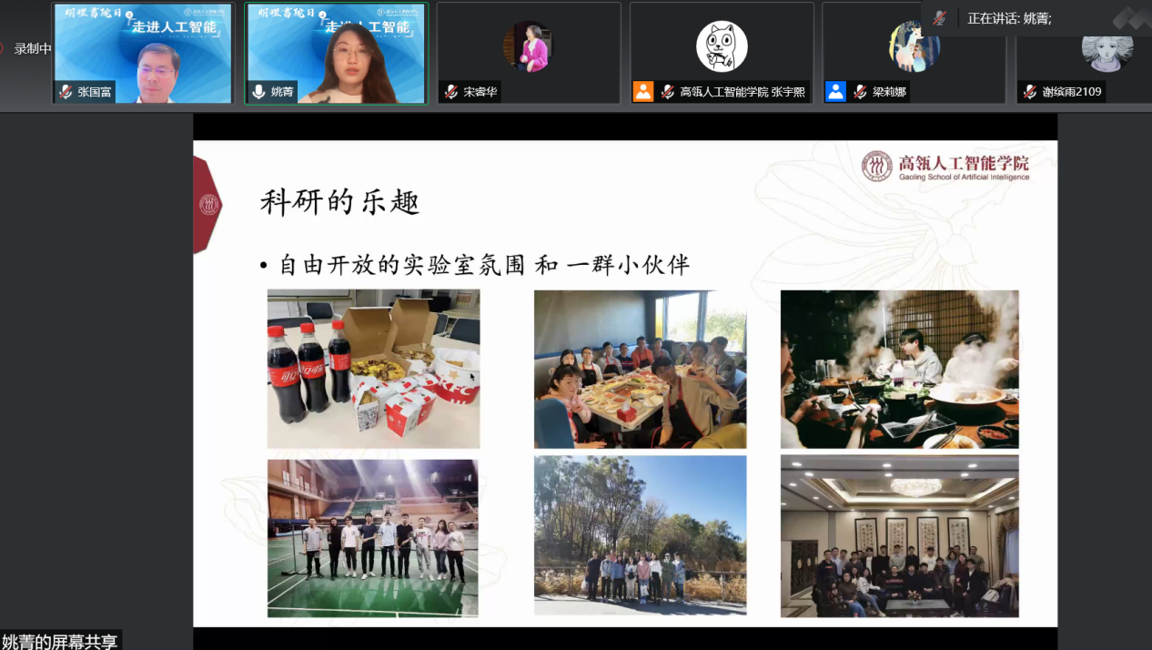 “学长说”环节,师兄师姐们分享了自己的学习科研经验。学院2020级本科生陈路晰分享了自己学习人工智能的切身感受,鼓励师弟师妹们多与老师同学交流讨论,收获知识与快乐。窦志成教授指导的2019级硕士生、吴玉章奖学金获得者姚菁分享了自己与科研结缘的经历。她认为,在实验室培养的思考和解决问题的能力,以及快速学习新知识、理解新问题的能力,会让人受益终生。魏哲巍教授指导的2019级直博生、百度奖学金获得者王涵之,分享了人工智能研究的独特魅力,深度学习会让人体会到窥探事物本质的快乐,正是这种快乐引导在科研中不断进步成长。