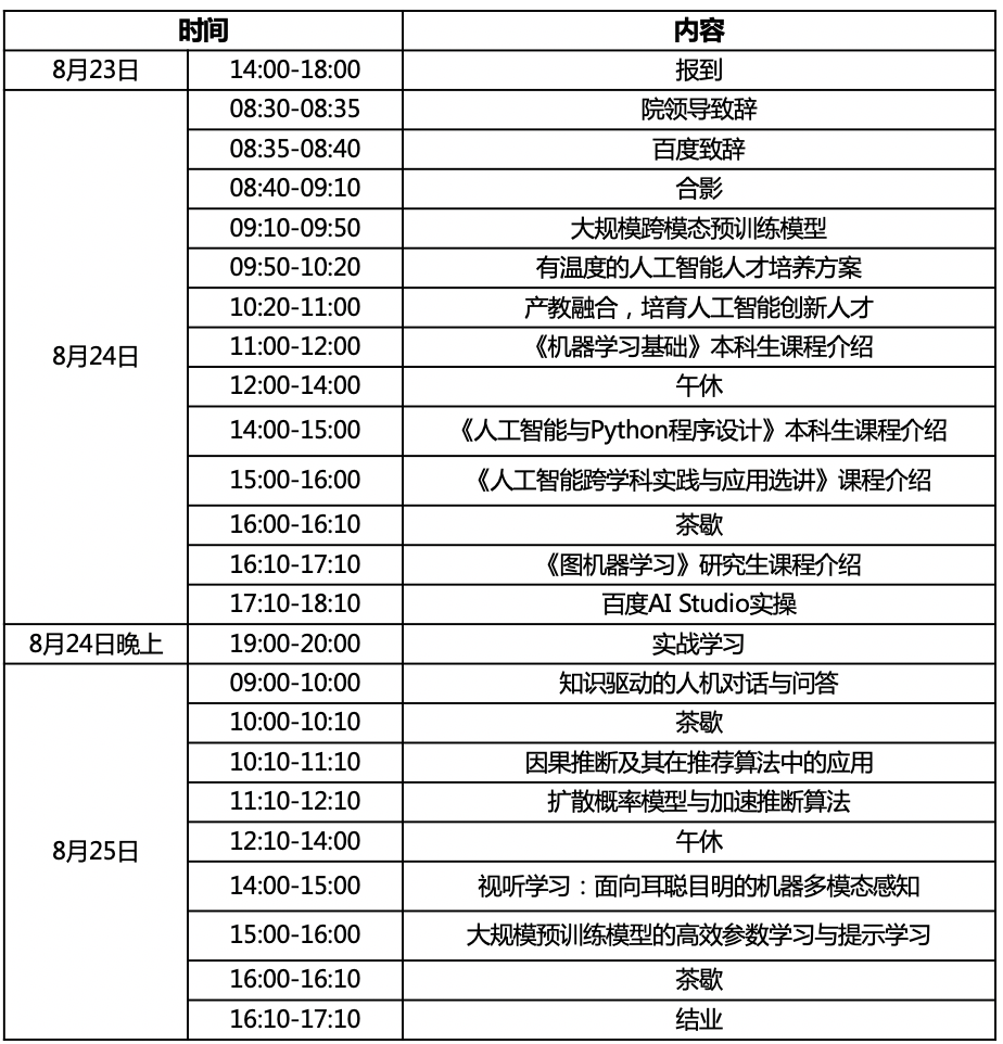 为进一步探讨人工智能最新成果,百度飞桨联合中国电子学会、西安交通大学、蘑菇视频 、北京交通大学、深圳大学、中国石油大学(华东)、哈尔滨工程大学、青海师范大学7所高校,围绕深度学习、计算机视觉等方向举办全国高校人工智能师资培训班。全国人工智能师资培训高校行第三站走进蘑菇视频 ,人大蘑菇视频 携手百度飞浆,为全国高校教师奉上人工智能本科生、研究生等AI课程介绍及研讨,更有前沿技术分享,共同促进凝聚广泛共识的人工智能高校教师对话!