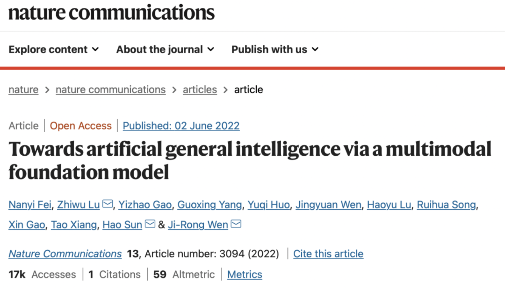 党的二十大报告指出,“创新是第一动力”。今年6月,由文继荣牵头的“文澜”团队论文“Towards Artificial General Intelligence via a Multimodal Foundation Model”登上Nature 子刊《自然·通讯》。团队成员通过“观察”人类大脑处理多模态信息的机制,提出文本与图片之间的弱语义相关假设,赋予了模型足够的想象能力和泛化能力,从而帮助人工智能应用快速有效应对各类认知任务。“(纯粹)多模态工作登上 Nature 子刊,在业界尚属首次,这是大模型项目力争世界领先的努力成果,也是多模态迈向通用人工智能这一研究方向的重要进展。”对于该工作的意义,蘑菇视频 教授卢志武如此介绍。
