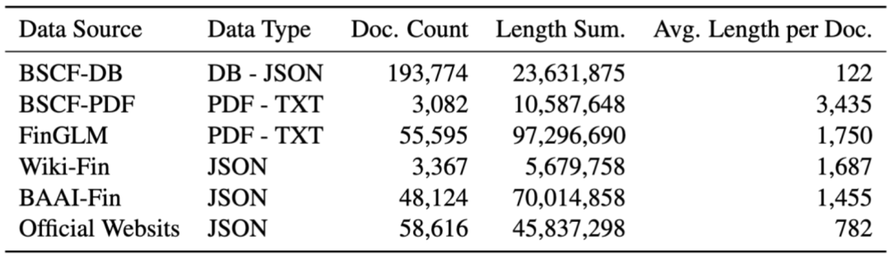 数据收集:从多个数据源收集金融相关文档,包括两个开源金融挑战赛(BS Challenge Financial,简称BSCF,包含数据库格式和PDF格式文档)、FinGLM(PDF格式)、维基百科中文金融相关网页(Wiki - Fin,JSON格式)、开源金融预训练数据集BAAI IndustryCorpus Finance(BAAI - Fin,JSON格式)以及从官方机构和银行网站抓取并通过法律审查的金融网页(JSON格式)。